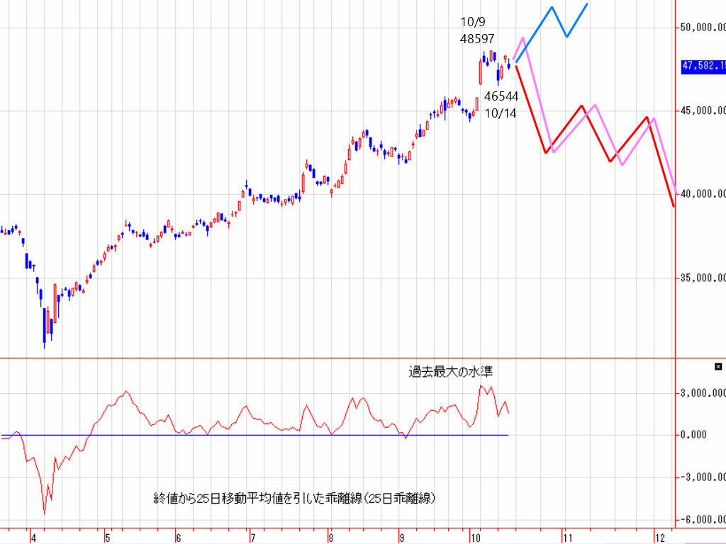 今後の展開は、「年末まで上昇の流れを継続するパターン」、「目先、10月9日の高値48597円を超えて、一段高を経過した後、戻り高値をつけるパターン」、「48597円が戻り高値となって、下降を開始するパターン」の3通りが考えられます。