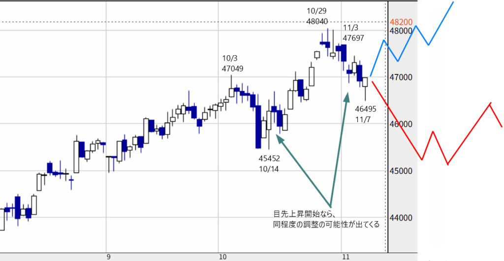 ただ、前週末、11月7日は、46495ドルまで下げた後、下ヒゲの長い陽線をつけて、下値を支えられる動きとなっています。