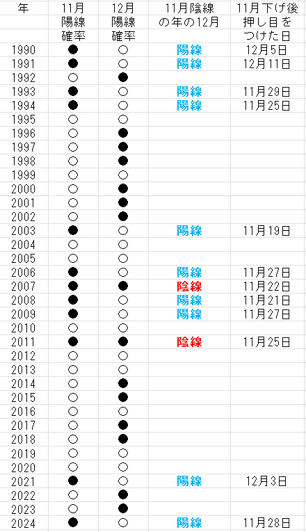 これを見ると、11月の月足が陰線引けした年は、12年中10回、12月の月足が陽線引けする展開になっていることがわかります。