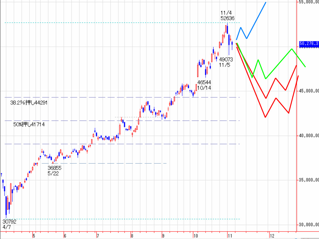 下げ幅を考慮すると、11月4日の高値52636円は、4月以降の上昇の終点になると考えられます。