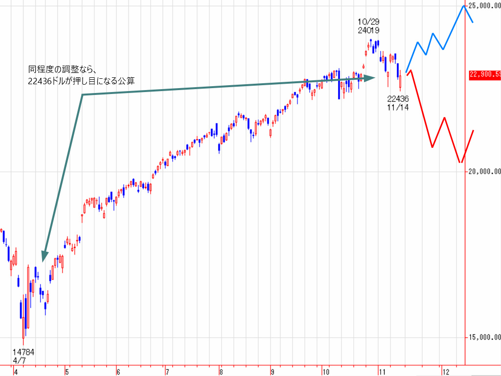 下げ幅や日柄の長さから、最近の下げの流れは、4月9日から21日までの調整と同程度の値幅(1517ドル幅)か、または、10月29日の高値24019ドルが4月以降の上昇の終点となった後の上げ幅全体の修正局面のどちらかだと推測できます。