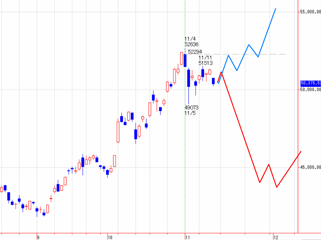 一方で、11月の月足が陰線引けする展開になる場合、目先の価格が11日の高値51513円を超えることなく、はっきりとした下げの流れを作り、一気に下値の目安になる場所まで下げる動きになると考えられます。