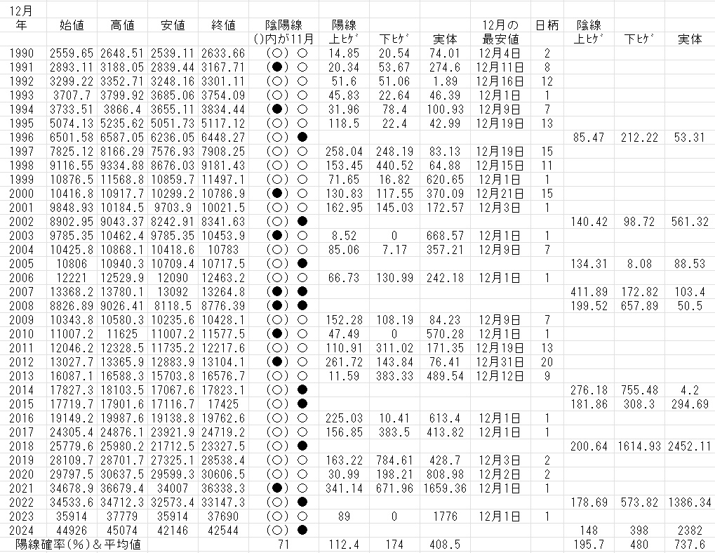 図中の数値は、1990年から2024年までの12月の4本値、月足の陰陽(陽線が〇、陰線が●)、陽線、陰線のときのローソク足の各部位の長さ、月足が陽線の年の最安値の日付と月初からの日柄になります。