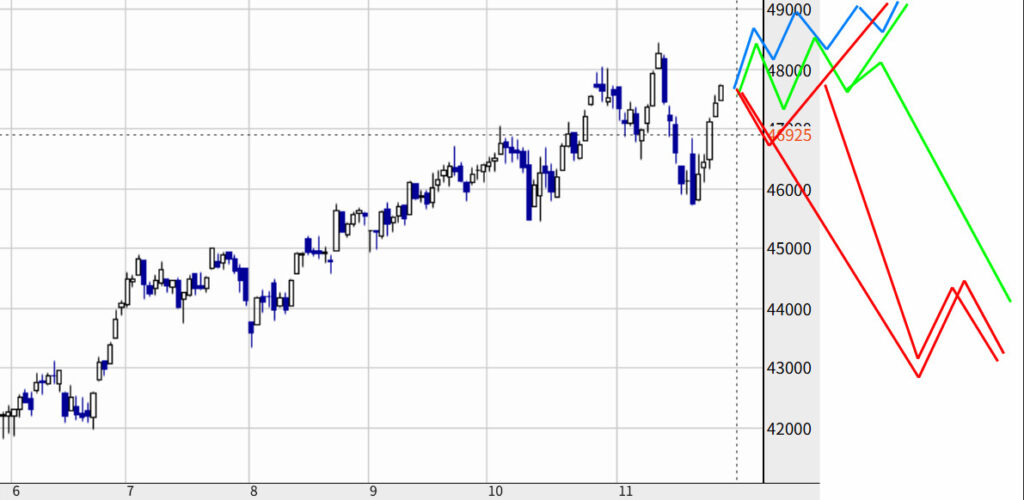 こちらの展開になる場合、週明け後は、11月27日の高値50322円前後で強く上値を抑えられて、下降を開始する公算です。