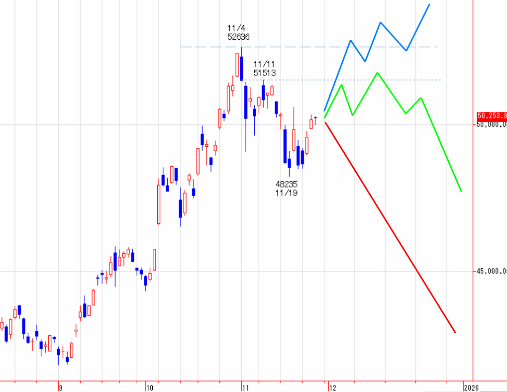 1つ目は、目先、11月11日の高値51513円まで上昇して、その後、上値の重さを確認する作業へ入り、右肩下がりのダブル・トップを形成する展開です。