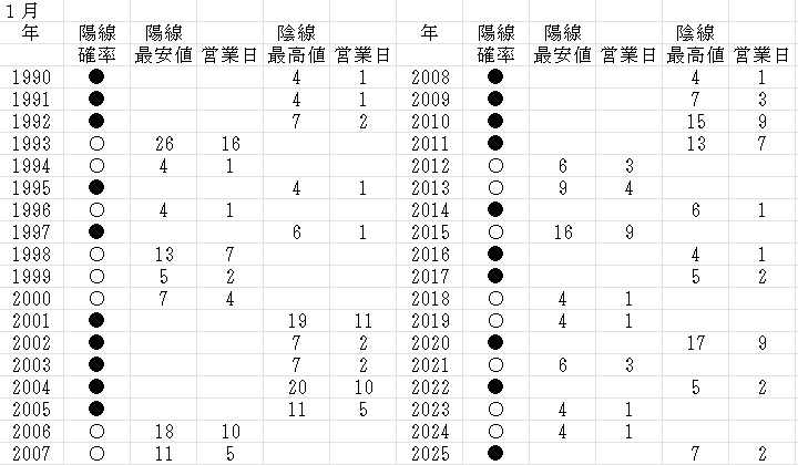 図中の数値は、1月の月足が陽線引けした年が“〇”、陰線引けした年が“●”で、陽線引けした年の1月の最安値をつけた日と、月初からの営業日、陰線引けした年の1月の最高値をつけた日と、月初からの営業日になります。
