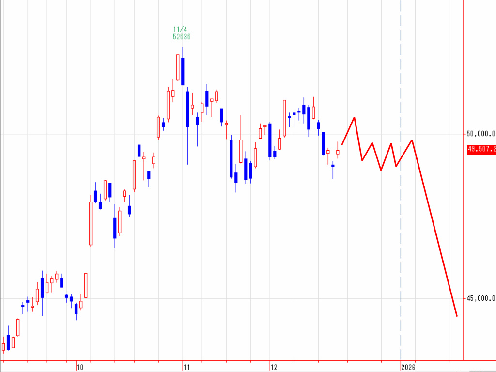 弱気の見方が正しければ、目先は、12月12日の高値51127円を前に上値を抑えられて、下降を開始するはずです。