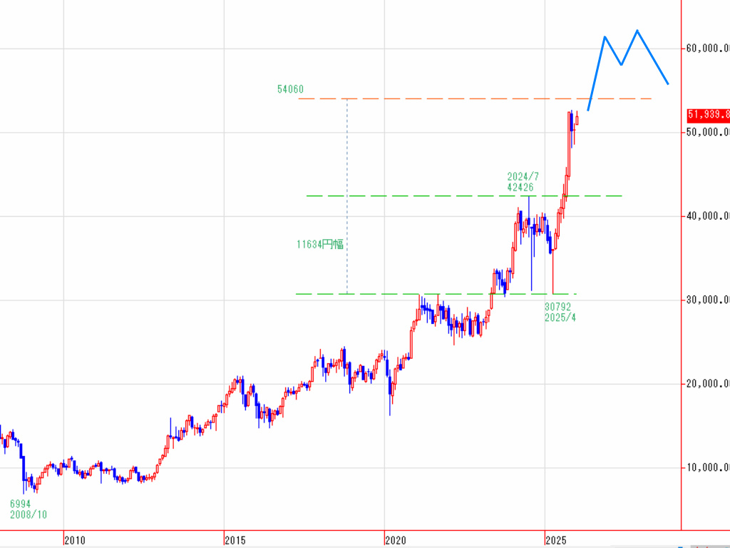 今後の価格が上昇を継続する場合、想定できる上値目標値は、2024年7月の高値42426円から2025年4月の安値30792円までの下げ幅(11634円幅)を42426円に加えた地点(54060円)を大幅に上回る地点になります。