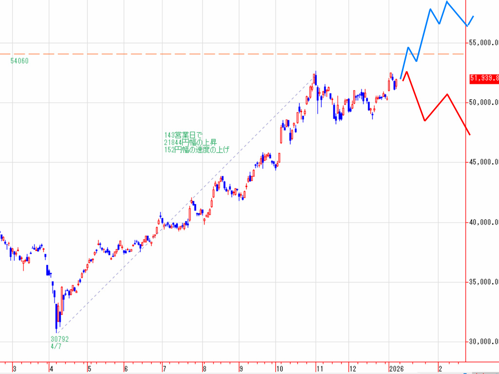 2025年4月以降の上昇の流れを継続しているなら、現在の上昇は、2025年4月から11月までの上昇と似た動きになる(21844円幅の上昇、1営業日152円幅の速度(21844円幅を上昇期間143営業日で割った値幅))と推測できます。