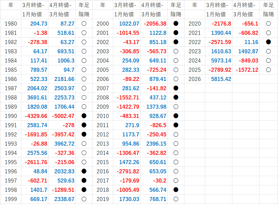 図表01は、1980年以降の1月から4月の値動きと、年間の陰陽です。