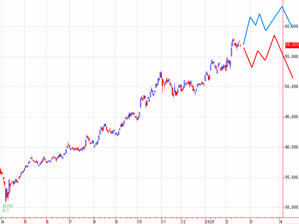 週明け後、戻り高値58015円を超えられず、2月17日の安値56135円を割れると、上値、下値を切り下げる弱気パターンを作り、その後の価格が大きく下げる動きになる可能性が出てきます。