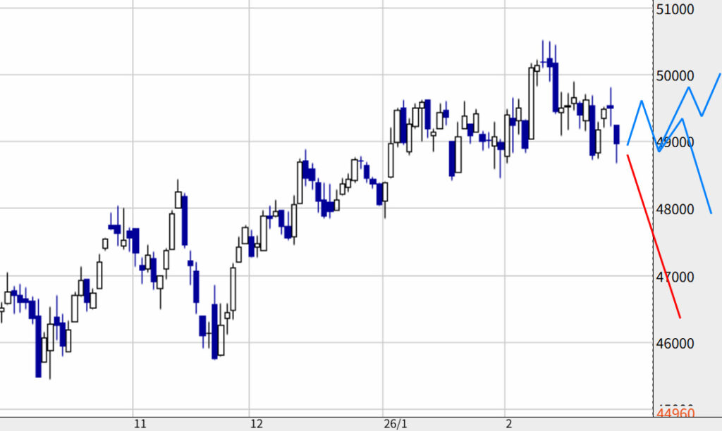 NYダウの1月以降の値動きから推測できる今後の展開は、「2月27日の安値48678ドルが押し目になって、徐々に下値を切り上げる動きを経過して、上昇を開始するパターン」、「昨年11月12日~20日と同程度の値幅の調整(2703ドル幅、47809ドルが下値の目安)を経過した後、下値堅さを確認する作業へ入るパターン」、「昨年10月14日の安値45452ドル前後まで一本調子に下げるパターン」の3通りが考えられます。