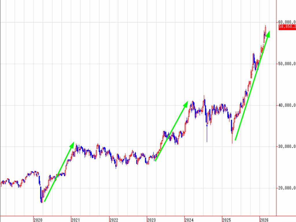 調整を終了した後、3月、4月に再上昇を開始して、戻り高値を超える動きとなっても、2020年以降の上昇パターンを繰り返すなら、目先つける戻り高値を超えても、すぐに上値を抑えられる動きになるはずです。