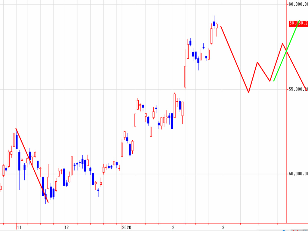 目先、58130円を割れる動きは、大勢の天井をつける動きか、大勢の天井型を作る作業へ入る動きになる可能性があります。