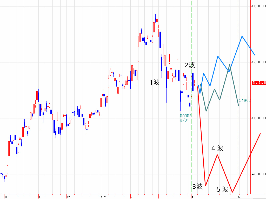 この見方が正しければ、本年4月は、「3月31日の安値50558円前後が押し目底になって、4月の月足が陽線引けする展開になる」、または、「4月中に現在の下げの終点をつける展開になる」という2通りのパターンに絞られます。